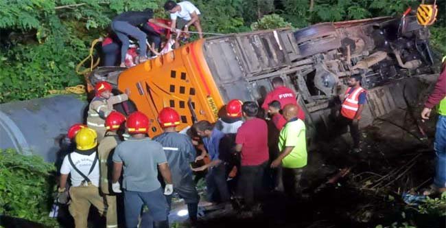 मुंबई : नवी मुंबई में मुंबई-पुणे हाइवे पर सोमवार को रात करीब एक बजे एक निजी बस सामने से आ रहे ट्रैक्टर से टकराकर खाई में करीब 40 फीट नीचे गिर गई। इस हादसे में पांच लोगों की मौके पर ही मौत हो गई, जबकि 42 लोग घायल हो गए। घायलों का एमजीएम और पनवेल के उपजिला अस्पताल में इलाज चल रहा है। नवी मुंबई पुलिस के अनुसार, मृतक व्यक्तियों में से तीन की पहचान हौसाबाई पाटिल, गुरुनाथ महाराज पाटिल, रामदास नारायण मुकादम के रूप में हुई। क्रेन की मदद से बस को खाई से ऊपर लाया गया। नवी मुंबई के डीसीपी विवेक पानसरे ने बताया कि डोंबिवली से करीब 54 लोग आषाढ़ी एकादशी पर बस से पंढरपुर जा रहे थे। रात करीब एक बजे बस सामने से आ रहे ट्रैक्टर से टकरा गई। इससे बस चालक का नियंत्रण बिगड़ गया और बस खाई में जा गिरी।